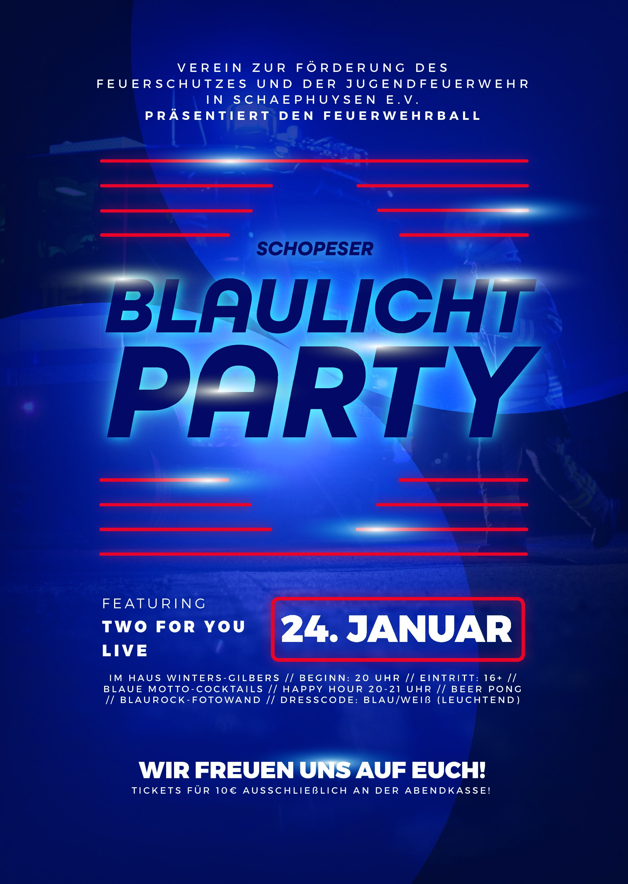Seid dabei, wenn der Verein zur Förderung des Feuerschutzes und der Jugendfeuerwehr in Schaephuysen e.V. wieder zum legendären Feuerwehrball einlädt – diesmal als unvergessliche Schopeser Blaulicht Party! Freut euch auf eine Nacht voller Highlights, cooler Beats und strahlend blauer Momente.